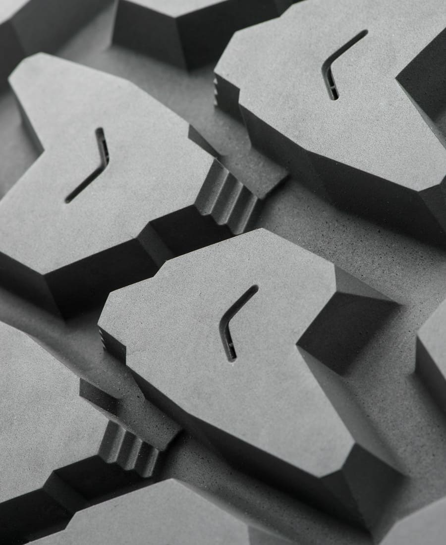 Обеспечивает долговечную прочность и мощное сцепление с дорогой благодаря агрессивному самоочищающемуся протектору и глубокой прорези для обеспечения максимального сцепления на неровных поверхностях и всех типах пересеченной местности
